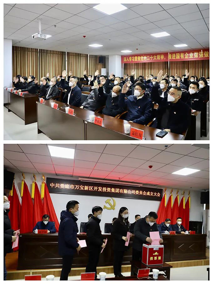 會議表決通過了選舉辦法(草案)、監票人推薦名單、計票人推薦名單,選舉產生了第一屆中共婁底市萬寶新區開發投資集團有限公司委員會委員5人,分別為陽文林、徐業波、謝緯、葛旭華、易志高,選舉產生了第一屆中共婁底市萬寶新區開發投資集團有限公司紀律檢查委員會委員5人,分別為葛旭華、楊亮軍、李哲、李雅琴、劉穎暢。