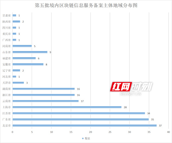 全國第五批境內區(qū)塊鏈信息服務備案主體地域分布圖。